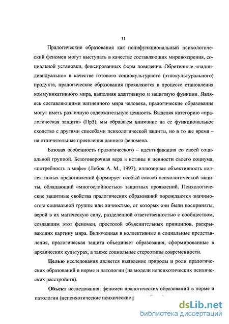 Объект исследования: феномен пралогических образований в норме и патологии (непсихотические психические расстройства).