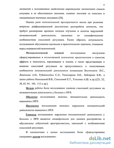 Гипотеза исследования: нарушения познавательной деятельности у больных с ИРЛ являются специфичными для данного расстройства и обусловлены избыточной пристрастностью, связанной с особенностями смысловой регуляции.