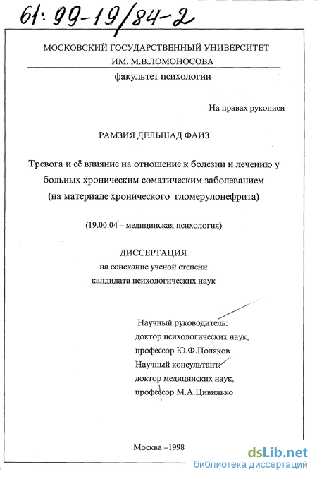 Результаты специальных психологических исследований нарушения психической деятельности при хронических соматических заболеваниях позволили сформулировать цель настоящего исследования: влияние тревоги на отношение к болезни, врачу и лечению у больных хроническим гломерулонефритом (ХГН). Впервые особое внимание уделялось анализу роли в этом процессе принятия позиции «больного человека».