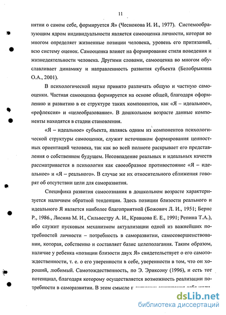 В психологической науке принято различать общую и частную самооценки. Частная самооценка формируется на основе общей, благодаря оформлению и развитию в ее структуре таких компонентов, как «Я - идеальное», «рефлексия» и «целеобразование». В дошкольном возрасте данные компоненты находятся в стадии становления.