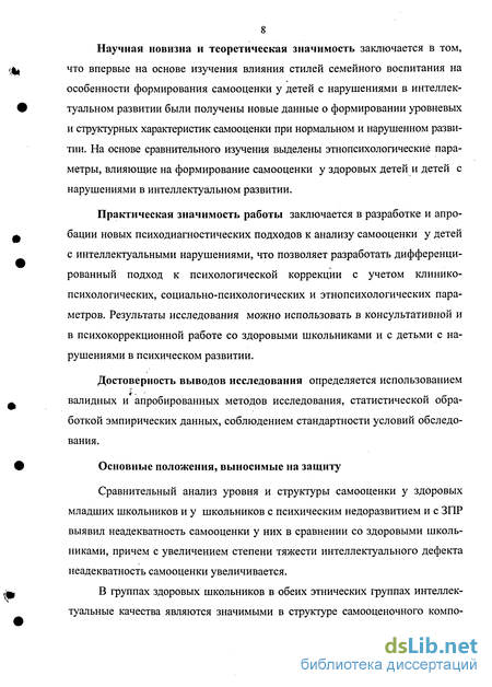 8 Научная новизна и теоретическая значимость заключается в том, что впервые на основе изучения влияния стилей семейного воспитания на особенности формирования самооценки у детей с нарушениями в интеллектуальном развитии были получены новые данные о формировании уровневых и структурных характеристик самооценки при нормальном и нарушенном развитии. На основе сравнительного изучения выделены этнопсихологические параметры, влияющие на формирование самооценки у здоровых детей и детей с нарушениями в интеллектуальном развитии.