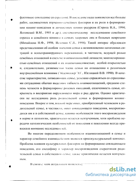 Теоретической базой исследования являются труды зарубежных авто- ров, в которых рассматриваемся теория стресса и копинга ( R.S.Lazarus., S.Folkman., L.I.Pearlin., С.Schooler., СМ.Snyder., H.Selye., R.Hill и др.), результаты исследования конині '-поведения (Сирота Н.А., Ялтонский В.М., Истомин С.Л., Лигер С.А., Михайлова 11.Ф., Таукенова Л.М., Ташлыков В.А. и др.) теория неврозов (Карвасарский Н.Д., Мясищев В.А., Александровский Ю.А., и др.), теории изучении семьи и семеііной психотерапии (Эйдемиллер Э.Г., Юстицкий В.В., Мягер В.К., Мишина Г.М., D. Edgar., R.Hill., H.I. McCubbin и др.).