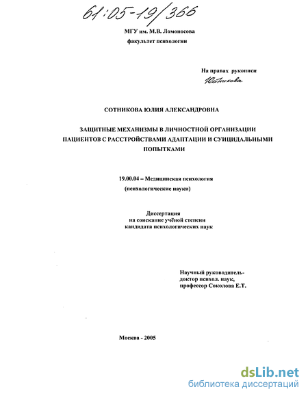 Цель работы: изучение структурной организации, функционирования защитных механизмов, факторов, определяющих их уровневое строение, включая клинико-психологические и индивидуально-типологические личностные особенности пациентов с расстройствами адаптации и суицидальными попытками.