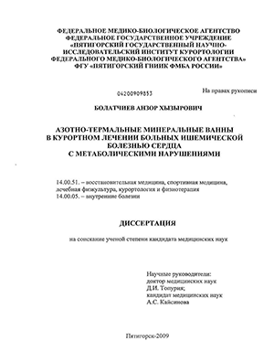 Балатчиев Анзор Хызырович. Азотно-термальные минеральные ванны в курортном лечении больных ИБС с метаболическими нарушениями : диссертация ... кандидата медицинских наук : 14.00.51 / Балатчиев Анзор Хызырович; [Место защиты: ГУ "Пятигорский государственный научно-исследовательский институт курортологии"].- Пятигорск, 2009.- 116 с.: ил.