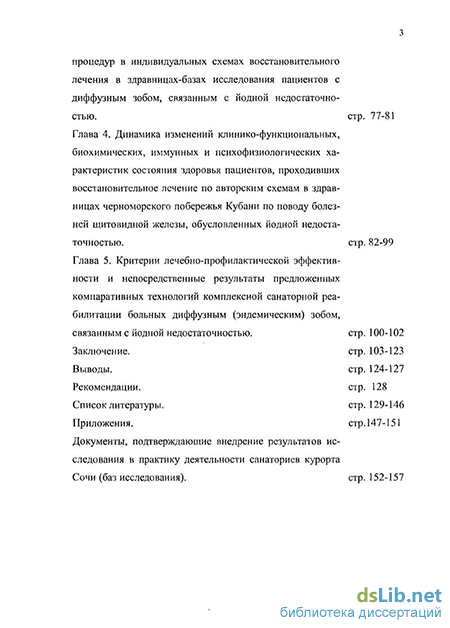 Структура и объем работы. Диссертационная работа состоит из введения, главы - обзора литературных и официальных источников по изучаемой проблеме, главы с изложением материалов, методов обследования и лечения наблюдаемых больных, 3-х глав собственных исследований, заключения, выводов, предложений, указателя литературы (115 отечественных и 56 зарубежных источников), приложений, в т ч документов, подтверждающих внедрение результатов работы в практику здравниц Краснодарского края Основной текст диссертации изложен на 144 страницах стандартного машинописного текста, включающего 38 иллюстраций (в тч 34 таблицы, диаграммы, схемы, рисунки) В первой главе исследования представлен авторский анализ прогрессивных методических и методологических подходов к задействованию климатобальнеофакторов отечественных и зарубежных рекреационных зон при восстановительном лечении пациентов, страдающих болезнями щитовидной железы, обусловленных йодной недостаточностью Вторая глава диссертационного исследования содержит непосредственные клинико-статистические материалы наблюдения, где представлены а) предмет и объект исследования, б) базы исследования и единицы наблюдения, в) методы обследования больных и статистической обработки полученных результатов исследования, г) методы лечения изучаемого контингента боль-