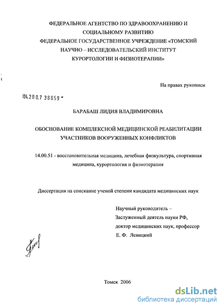 Барабаш Лидия Владимировна. Обоснование комплексной медицинской реабилитации участников вооруженных конфликтов : диссертация ... кандидата медицинских наук : 14.00.51 / Барабаш Лидия Владимировна; [Место защиты: ФГУ "Томский научно-исследовательский институт курортологии и физиотерапии"].- Томск, 2006.- 129 с.: ил.