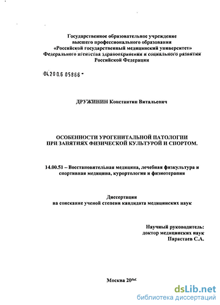 Дружинин Константин Витальевич. Особенности урогенитальной патологии при занятиях физической культурой и спортом : диссертация ... кандидата медицинских наук : 14.00.51 / Дружинин Константин Витальевич; [Место защиты: ГОУВПО "Российский государственный медицинский университет"].- Москва, 2006.- 141 с.: ил.