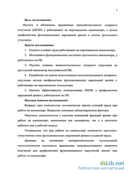 Изучить и обосновать применение низкоинтенсивного лазерного излучения (НИЛИ) у работающих на персональном компьютере, с целью профилактики функциональных нарушений зрения и снятия зрительного утомления.