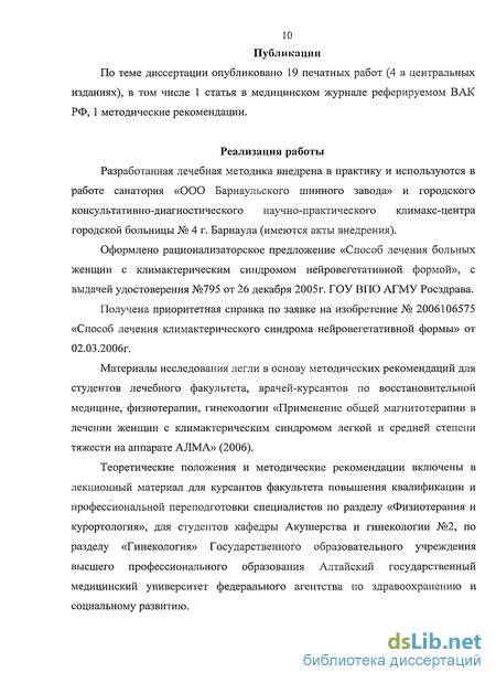 Материалы исследования легли в основу методических рекомендаций для студентов лечебного факультета, врачей-курсантов по восстановительной медицине, физиотерапии, гинекологии «Применение общей магнитотерапии в лечении женщин с климактерическим синдромом легкой и средней степени тяжести на аппарате «АЛМА» (2006).