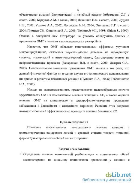 В последние годы широкое распространение в различных областях медицины получило применение общей магнитотерапии (ОМТ), которая обеспечивает высокий биологический и лечебный эффект (Абрамович С.Г. с соавт., 2000; Беркутов A.M. с соавт., 2000; Левицкий Е.Ф. с соавт., 2000; Дуруда Н.В., 2002; Ушаков А.А., 2002; Лесовская М.И., 2004; Онищенко Г.Г. с соавт., 2004; Плетнев СВ., Остапенко В.А., 2005; Weintroub M.I., 1998; Ghiom S., 1999). Однако в доступной нам литературе не удалось обнаружить данных о применении ОМТ в лечении климактерических расстройств.