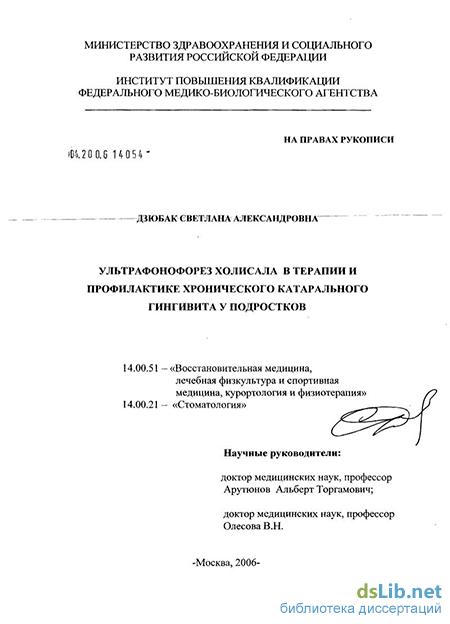 Дзюбак Светлана Александровна. Ультрафонофорез холисала в терапии и профилактике хронического катарального гингивита у подростков : диссертация ... кандидата медицинских наук : 14.00.51 / Дзюбак Светлана Александровна; [Место защиты: ФГУ "Российский научный центр восстановительной медицины и курортологии"].- Москва, 2006.- 110 с.: ил.