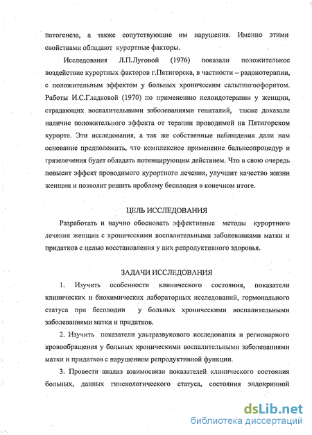 Исследования Л.П. Луговой (1976) показали положительное воздействие курортных факторов г.Пятигорска, в частности — радонотерапии, с положительным эффектом у больных хроническим сальпингоофоритом. Работы И.С.Гладковой (1970) по применению пелоидотерапии у женщин, страдающих воспалительными заболеваниями гениталий, также доказали наличие положительного эффекта от терапии проводимой на Пятигорском курорте. Эти исследования, а так же собственные наблюдения дали нам основание предположить, что комплексное применение бальнеопроцедур и грязелечения будет обладать потенцирующим действием. Что в свою очередь повысит эффект проводимого курортного лечения, улучшит качество жизни женщин и позволит решить проблему бесплодия в конечном итоге.