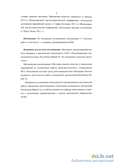 Апробация работы. Основные материалы исследования доложены на Международной научно-практической конференции «Роль профилактики и диспансеризации в охране общественного здоровья» (г. Москва, 2009 г.); Международной научно-практической конференции «Особенности формирования здорового образа жизни: факторы и условия» (г. Улан-Удэ, 2009 г.); XIV Всероссийской научно-практической конференции с международным участием «Молодые ученые в медицине» (г. Казань, 2009 г.); XII научно-практической конференции врачей-интернов и клинических ординаторов (г. Йошкар-Ола, 2009 г.); V международной (XIV Всероссийской) Пироговской научной медицинской конференции студентов и молодых ученых (г. Москва, 2010 г.); Всероссийской научно-практической конференции «Улучшение качества оказываемой населению медицинской помощи в Российской Федерации: проблемы и пути решения (г. Курган, 2010 г.); Всероссийской научно-практической конференции «Здоровье экономически активного населения» (г. Казань, 2010 г.); Республиканской научно-практической конференции организаторов здравоохранения «Основные направления и перспективы модернизации регионального здравоохранения» (г. Казань, 2010 г.); заседании кафедры общественного здоровья и организации здравоохранения с курсом медицинской информатики КГМУ (г. Казань, 2010 г.); Первой научно-практической конференции «Современные средства мониторинга состояния здоровья населения. Перспектива развития скрининга» (г. Москва, 2011г.); Международной научно-практической конференции «Актуальные достижения европейской науки» (г. София, Болгария, 2011 г.); Международной научно-практической конференции «Актуальные научные достижения» (г. Прага, Чехия, 2011 г.).
