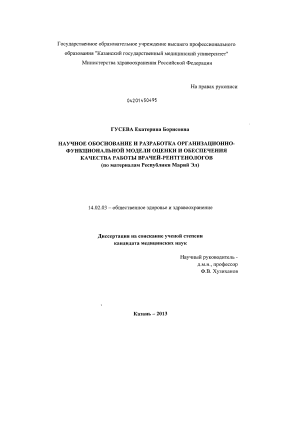 Научная новизна. Впервые разработана организационно-функциональная модель оценки и обеспечения качества работы врачей-рентгенологов Республики Марий Эл, в основе которой лежит изучение влияния медико-социальных факторов на качество работы врачей-рентгенологов, разработка мероприятий по коррекции их влияния, а также два вида оценки качества работы врачей-рентгенологов – профессиональная (осуществляемая экспертами) и непрофессиональная (осуществляемая лечащими врачами и пациентами).