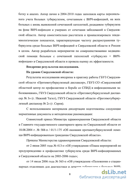 Личный вклад автора. Автором самостоятельно разработана программа и план исследования; проведен аналитический обзор литературы и нормативных актов, регламентирующих вопросы организации медицинской помощи больных с сочетанием туберкулеза и ВИЧ-инфекции. Автор самостоятельно проводила сбор первичного материала, его статистическую обработку и анализ. Автор лично в 2004-2010 годах заполняла карты персонального учета больных туберкулезом, сочетанным с ВИЧ-инфекцией, на всех больных с вновь выявленной сочетанной патологией, рецидивом туберкулеза на фоне ВИЧ-инфекции и умерших от сочетания заболеваний в Свердловской области. Автор самостоятельно рассчитала и проанализировала эпидемиологические показатели, характеризующие частоту распространения туберкулеза среди больных ВИЧ-инфекцией в Свердловской области и России в целом. Автор разработала мероприятия по совершенствованию медицинской помощи больным с сочетанной патологией «туберкулез + ВИЧ-инфекция» в Свердловской области и провела оценку их эффективности.