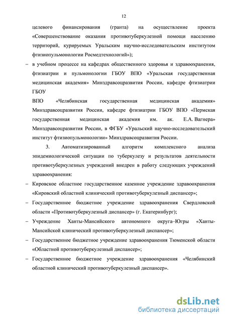 в учебном процессе на кафедрах общественного здоровья и здравоохранения, фтизиатрии и пульмонологии ГБОУ ВПО «Уральская государственная медицинская академия» Минздравсоцразвития России, кафедре фтизиатрии ГБОУ ВПО «Челябинская государственная медицинская академия» Минздравсоцразвития России, в ФГБУ «Уральский научно-исследовательский институт фтизиопульмонологии» Минздравсоцразвития России.