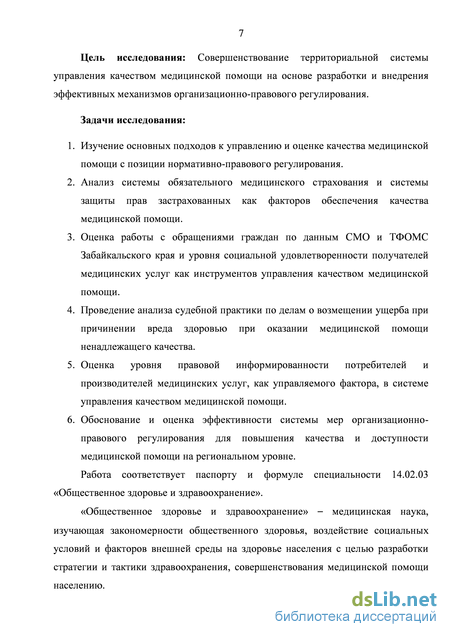 Цель исследования: Совершенствование территориальной системы управления качеством медицинской помощи на основе разработки и внедрения эффективных механизмов организационно-правового регулирования.