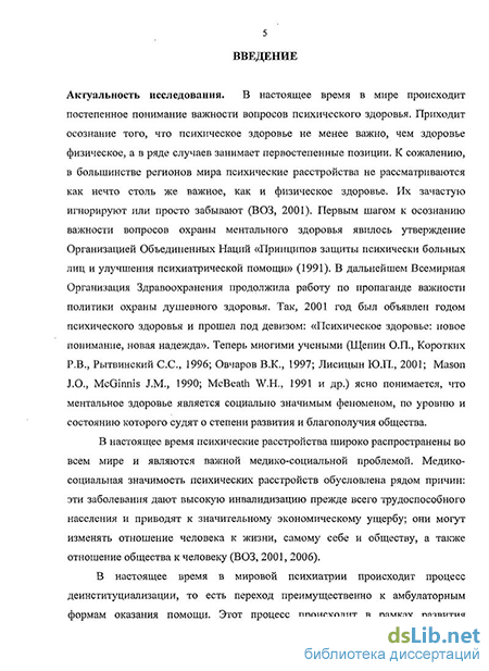 Актуальность исследования. В настоящее время в мире происходит постепенное понимание важности вопросов психического здоровья. Приходит осознание того, что психическое здоровье не менее важно, чем здоровье физическое, а в ряде случаев занимает первостепенные позиции. К сожалению, в большинстве регионов мира психические расстройства не рассматриваются как нечто столь же важное, как и физическое здоровье. Их зачастую игнорируют или просто забывают (ВОЗ, 2001). Всемирная Организация Здравоохранения проводит активную работу по пропаганде важности политики охраны душевного здоровья. Так, 2001 год был объявлен годом психического здоровья и прошел под девизом: «Психическое здоровье: новое понимание, новая надежда». Сегодня многими учеными (Щепин О.П., Коротких Р.В., Рытвинский С.С., 1996; Овчаров В.К., 1997; Лисицын Ю.П., 2001; Mason J.O., McGinnis J.M., 1990; McBeath W.H., 1991 и др.) признается, что ментальное здоровье является социально значимым феноменом, по уровню и состоянию которого можно судить о степени развития и благополучия общества.