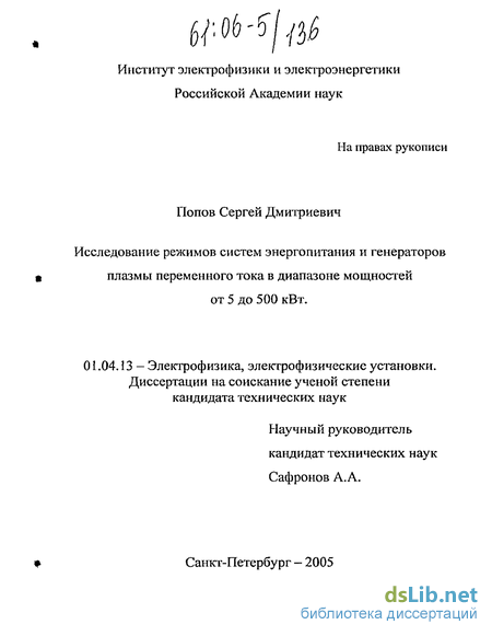 - Исследование электродуговой системы, включающей в себя в качестве нагрузки трёхфазный высоковольтный плазмотрон переменного тока с торцевыми электродами.