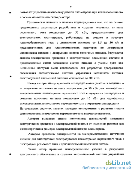 Вклад автора. Автор принимал непосредственное участие в создании и исследовании источника питания мощностью до 50 кВт для многофазных высоковольтных плазмотронов переменного тока с торцевыми электродами и создании источника питания мощностью до 10 кВт для однофазных высоковольтных плазмотронов переменного тока с торцевыми электродами На созданных системах питания проводил эксперименты с разными типами электродуговых плазмотронов переменного тока в качестве нагрузки.