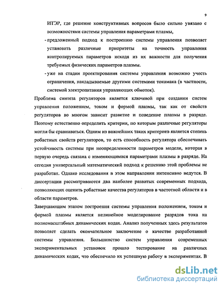 его интеграла. Одним из преимуществ простых регуляторов являлась их робастная устойчивость, что было следствием грубости модели, используемой для синтеза [11]. Быстрое развитие компьютерной цифровой техники позволило значительно расширить возможности анализа и сложность построения систем управления параметрами плазмы в токамаках. В первую очередь это относится к резкому увеличению числа контролируемых переменных, и, как следствие, управление формой плазмы в реальном времени стало вполне осуществимой задачей. Одновременно появились возможности использования сложных алгоритмов восстановления формы плазмы по магнитным измерениям в реальном времени (XLOC алгоритм [12], EFIT алгоритм [13], функциональная параметризациями]). Следующим естественным шагом на пути построения систем управления стали исследования для создания математических моделей, описывающих динамику положения, тока и формы плазмы. В диссертации произведен подробный анализ этих исследований и предложен современный подход к решению данной проблемы. На базе моделей для управления положением, током и формой плазмы с обратной связью стало возможным применение различных подходов синтеза регуляторов для объектов со многими входами и выходами. Построенные на базе моделей и регуляторов, рассмотренных в диссертации, системы управления положением, током и формой плазмы обладают следующими техническими достоинствами [15]: