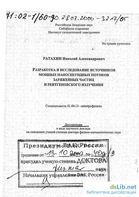 Ратахин Николай Александрович. Разработка и исследование источников мощных наносекундных потоков заряженных частиц и рентгеновского излучения : диссертация ... доктора физико-математических наук в форме науч. докл. : 01.04.13.- Томск, 2000.- 56 с.: ил. РГБ ОД, 71 02-1/60-9