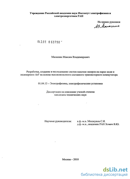 На основании вышесказанного видно, что разработка и создание долговечных, надежных и эффективных систем накачки ЛПМ и эксимерных ArF лазеров на основе современной твердотельной элементной базы поможет избежать указанных недостатков существующих систем питания и является весьма актуальным направлением исследований.