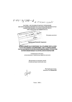 Прибытков Геннадий Андреевич. Межфазный массоперенос на границе металлов и тугоплавких соединений с металлическими расплавами и его роль в формировании структуры композиционных материалов и покрытий : диссертация ... доктора технических наук : 05.16.01.- Томск, 2002.- 388 с.: ил. РГБ ОД, 71 03-5/310-2