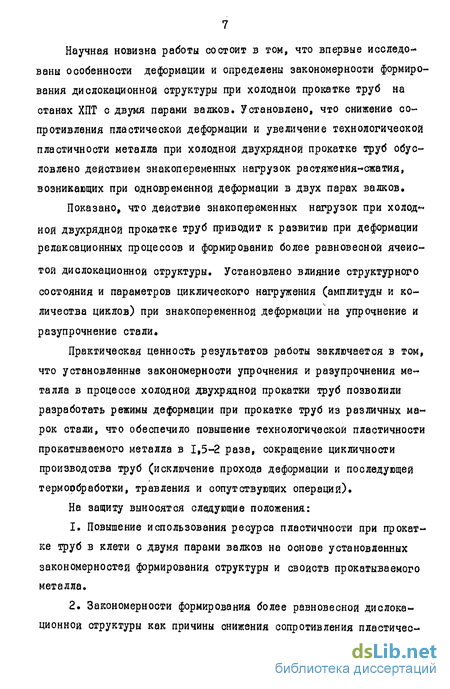 Для обеспечения возможности практической реализации такого процесса необходима оценка влияния новых условий деформации на формирование структуры и свойств прокатываемого металла. Это становится особенно важным при изготовлении на этом оборудовании холоднодсформированных труб для атомной энергетики с регламентированной структурой и свойствами металла, повышенной точностью размеров и чистоты поверхности. Научная новизна работы состоит в том, что впервые исследованы особенности деформации и определены закономерности формирования дислокационной структуры при ХОЛОДНОЙ прокатке труб на станах ХПТ с двумя парами валков. Установлено, что снижение сопротивления пластической деформации и увеличение технологической пластичности металла при холодной двухрядной прокатке труб обусловлено действием знакопеременных нагрузок растяжения-сжатия, возникающих при одновременной деформации в двух парах валков.