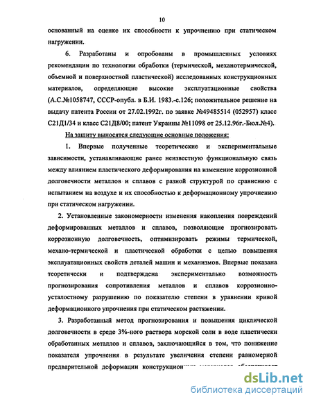 6. Разработаны и опробованы в промышленных условиях рекомендации по технологии обработки (термической, механотермической, объемной и поверхностной пластической) исследованных конструкционных материалов, обеспечивающие высокие эксплуатационные свойства изделий (А.С. № 1058747, СССР - опубл. в Б. И. 1983. - с. 126; положительное решение на выдачу патента России от 27.02.1992 г. по заявке № 49485514 (052957) класс С21Д1/34 и класс С21Д8/00; патент Украины № 11098 от 25.12.96 г. - Бюл. № 4).
