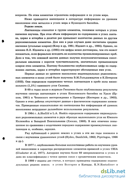 В 1980 г изданы две статьи, в которых приведены содержания индивидуальных редких земель в углях Болгарии и Канады. K.N.Kostadinov и R.G.Djingova (1980) определили 30 элементов-примесей в 100 образцах Болгарских углей методом нейтронной активации, в том числе La, Се, Nd, Sm, Eu, Tb, Yb, Lu. B.I.Kronberg и др.(1980) опубликовали информацию о содержании 52 элементов-примесей в 10 образцах угля из четырех угленосных районов Канады. Важно, что в работе приведены данные по большой группе лантаноидов, в том числе по Рг, Nd, Gd, Dy, Но, Ег и Ти, которые в углях почти не изучались. Целая серия работ, посвященных изучению закономерностей распределения редкоземельных элементов в углях, опубликована Г.М. Ескенази с соавторами (Ескенази и др., 1978, 1984, 1991).