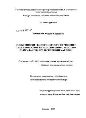 Монтин Андрей Сергеевич. Особенности геологического строения и платиноносность расслоенного массива Луккулайсваара в Северной Карелии : диссертация ... кандидата геолого-минералогических наук : 25.00.11 / Монтин Андрей Сергеевич; [Место защиты: Моск. гос. ун-т им. М.В. Ломоносова].- Москва, 2009.- 132 с.: ил. РГБ ОД, 61 09-4/165