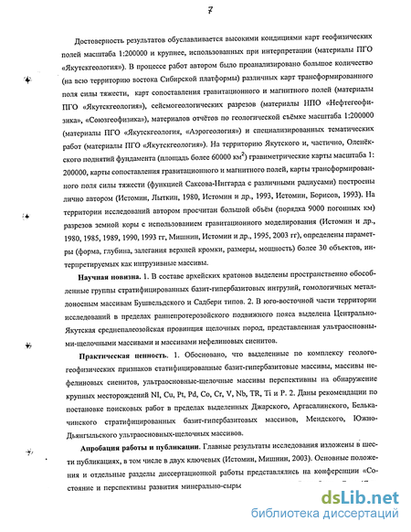 Достоверность результатов обуславливается высокими кондициями карт геофизических полей масштаба 1:200000 и крупнее, использованных при интерпретации (материалы ПГО «Якутскгеология»). В процессе работ автором было проанализировано большое количество (на всю территорию востока Сибирской платформы) различных карт трансформированного поля силы тяжести, карт сопоставления гравитационного и магнитного полей (материалы ПГО «Якутскгеология»), сейсмогеологических разрезов (материалы НПО «Нефтегеофи-зика», «Союзгеофизика»), материалов отчётов по геологической съёмке масштаба 1:200000 (материалы ПГО «Якутскгеология, «Аэрогеология») и специализированных тематических работ (материалы ПГО «Якутскгеология»). На территорию Якутского и, частично, Оленек-ского поднятий фундамента (площадь более 60000 км ) гравиметрические карты масштаба 1: 200000, карты сопоставления гравитационного и магнитного полей, карты трансформированного поля силы тяжести (функцией Саксова-Ниггарда с различными радиусами) построены лично автором (Истомин, Лыткин, 1980, Истомин и др., 1993, Истомин, Борисов, 1993). На территории исследований автором просчитан большой объём (порядка 9000 погонных км) разрезов земной коры с использованием гравитационного моделирования (Истомин и др., 1980,1985,1989, 1990,1993 гг, Мишнин, Истомин и др., 1995, 2003 гг), определены параметры (форма, глубина, залегания верхней кромки, размеры, мощность) более 30 объектов, интерпретируемых как интрузивные массивы.