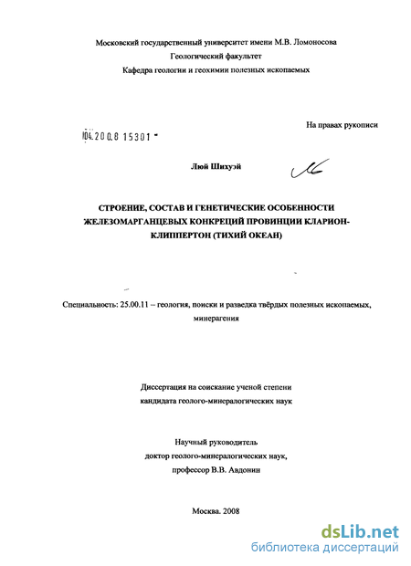 Актуальность темы. Образование железомарганцевых конкреций — глобальное природное явление, происходящее на границе гидросферы и литосферы на дне океанов. Формация железомарганцевых конкреций абиссальных котловин (ЖМК) широко развита на океанском дне, отдельные поля скопления конкреций весьма перспективны для промышленного освоения. С начала 1960-х годов конкрециями заинтересовались многие промышленные фирмы и развернули планомерные геологоразведочные работы. Уже в 1974 г. в ООН подается заявка от имени США на открытие первого месторождения ЖМК в районе Северо-Восточной котловины Тихого океана между разломами Кларион и Клиппертон. Работы быстро приняли международный характер, исследования проводили СССР, ФРГ, Англия, Франция, Япония, Австралия, Новая Зеландия и Китай. Ученые многих стран изучают руды ЖМК: получены многочисленные результаты и материалы по конкрециям. Тем не менее, проблемы генезиса конкреций весьма далеки от решения. Для расшифровки всей совокупности процессов образования конкреций необходимо тщательное изучение строения и состава конкреций на макро-, микро- и ультрамикроскопическом уровнях. Комплексное изучение ЖМК - одно из важнейших условий, определяющих возможность промышленного освоения залежей этого ценного полиметалльного сырья.