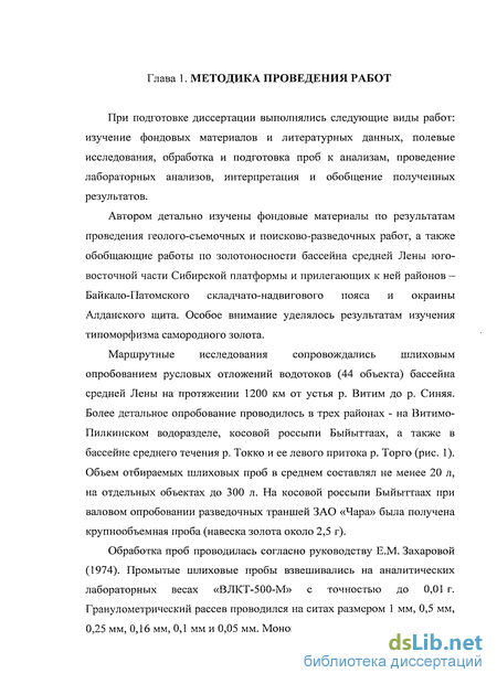 Основой работы служат материалы полевых и лабораторных исследований россыпного золота, проведенных автором в Институте геологии алмаза и благородных металлов СО РАН в 1998-2008 г.г. Россыпное золото из аллювиальных отложений средней Лены изучалось от устья р. Витим до устья р. Синяя, по коллекции, собранной в полевой сезон В.Е. Филипповым и З.С. Никифоровой. Дополнительно к этому изучено золото из аллювиальных отложений бассейна р. Чара (косовая россыпь Быйыттаах, руч. Мелике), русловых отложений среднего течения р. Токко (руч. Аномальный) и р. Торго (Богодикта, Тандыкагыкта, Соктокут), причем, впервые исследовано рудное золото из Александровской рудной зоны Мурунского сиенитового массива. Данная коллекция золота любезно предоставлена к.г.-м.н. А.А. Сурниным. Изучена коллекция россыпного золота (ГУП PC (Я) ЯПСЭ) из аллювиальных отложений Витимо-Пилкинского водораздела. Полевые изыскания проводились на территории юго-востока Сибирской платформы в бассейне р. Чара.