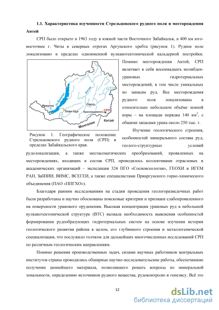 Наиболее полное представление всех аспектов геологического строения молибден-урановых месторождений СРП и Урулюнгуевского района содержится в работах Л.П. Ищуковой, И.А. Модникова, И.В. Сычева (Модников, Сычев, 1984; Ищукова, 1989; Ищукова и др., 1991; Ищукова, 1995; Ищукова и др., 1998; Ищукова, 2007), в которых был обобщен колоссальный по объму материал, включающий информацию о геологии, тектонике, морфологии месторождений, а также вещественном составе руд. Наиболее объмную характеристику местасоматических процессов на месторождениях Стрельцовской (Тулукуевской) кальдеры и вертикальной зональности на месторождениях Стрельцовское и Антей содержат работы О.В. Андреевой и В.А. Головина (Андреева и др., 1996; Андреева, Головин, 1998). Результаты геохронологического U-Pb-изотопного изучения процессов формирования месторождений СРП и в частности месторождения Стрельцовское отражены в работах И.В. Чернышева и В.Н. Голубева (Чернышев, 1978; Чернышев, Голубев, 1996). Было установлено, что промышленные урановые руды, как в фундаменте Стрельцовской кальдеры, так и в породах верхнего структурного этажа формировались в мезозойское время.