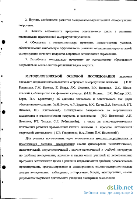 МЕТОДОЛОГИЧЕСКОЙ ОСНОВОЙ ИССЛЕДОВАНИЯ являются психолого-педагогические положения о процессе саморегуляции личности ( B.IL Еояринцев, Г.М. Бреслав, К. Изард, Л.С. Славина, В.К Вилюнас, Д.С. Шима-новский ); об искусстве как феномене культуры (М.М. Бахтин, B.C. Библер, Ю.Б. Борев, П.А. Кропоткин); об единстве этического и эстетического как форм общественного сознания (А.И. Буров, А.Ф. Еремеев, М.С, Каган, В.А. Разумный. Б.Т. Лихачев, Е.В. Квятковский). Исследование базировалось на теоретичесжих положениях о взаимодействии искусства и воспитания (Л.С. Выготский, А.Н. Леонтьев, Б.Т. Теплов, С.Л. Рубинштейн), а также на этико-педагогических положениях развития нравственных качеств личности в процессе эстетической творческой деятельности ( ЮВ. Гавриловец, В.А. Левин, Б.М. Неменский ).