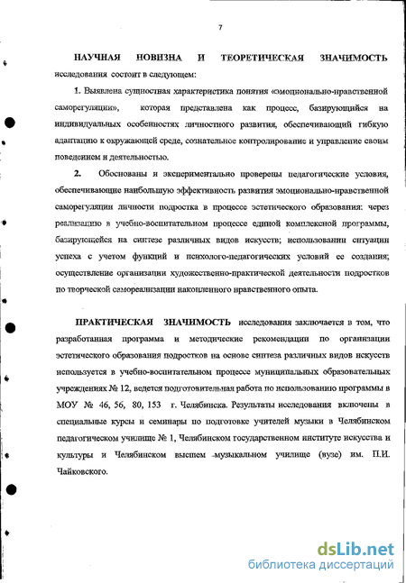 2. Обоснованы и экспериментально проверены педагогические условия, обеспечивающие наибольшую эффективность развития эмоционально-нравственной саморегуляции личности подростка в процессе эстетического образования: через реализацию в учебно-воспитательном процессе единой комплексной программы, базирующейся на синтезе различных видов искусств; использовании ситуации успеха с учетом функций и психолого-педагогических условий ее создания; осуществление организации художественно-практической деятельности подростков по творческой самореализации накопленного нравственного опыта.