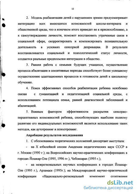 1. В новых социальных и экономических условиях жизни детей-инвалидов по зрению полноценное осуществление социально-педагогической реабилитации возможно в дифференцированном учреждении при условии функционирования школы-интерната как открытой социально-педагогической системы.