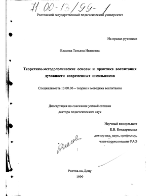 Все вышеуказанное обусловило выбор темы настоящего исследования, которое проведено на двух уровнях гносеологическом - научно-педагогические основы, теоретическая разработка части педагогической реальности, и на онтологическом - изучение реальной педагогической практики и методологическая рефлексия путей воспитания духовности школьников в деятельности педагогических коллективов инновационных школ, - "Теоретико-методологические основы и практика воспитания духовности современных школьников".