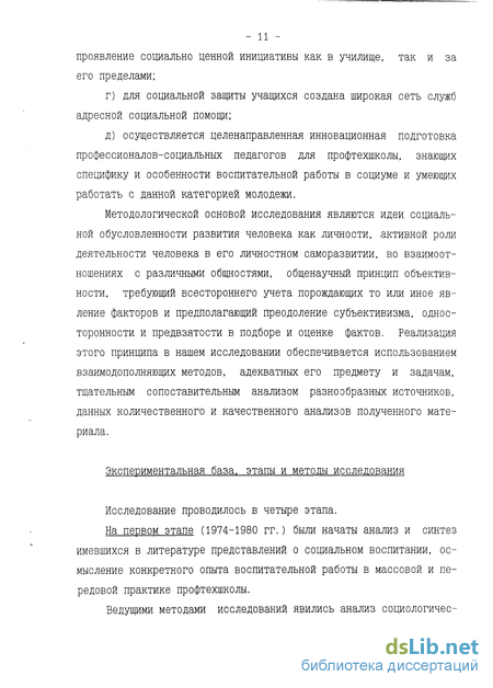 Ведущими методами исследований явились анализ социологичес -кой, экономической, философской, психолого-педагогической литературы по проблеме, изучение массовой практики и передового опыта, наблюдение, моделирование. Применялся ретроспективный анализ деятельности соискателя в должности преподавателя, заместителя директора по учебно-воспитательной работе ПТУ № 14 г.Щекина Тульской области. Был изучен опыт работы ПТУ Ш 4, 9, 25, 29 г.Тулы, ПТУ II, 2г. Новомосковска, ПТУ Ш 6, 13 г. Щекина. Опираясь на собственный опыт и начатую опытно-экспериментальную работу, была разработана первоначальная модель процесса социального воспитания учащихся с акцентом на деятельность комсомольской организации среднего ПТУ. Итогом данного этапа стала кандидатская диссертация на тему "Формирование нравственного сознания и поведения учащихся в деятельности комсомольской организации среднего городского профессионально-технического училища", защищенная в ноябре 1979 г. в НИИ общим проблем воспитания АПН СССР (научный руководитель М.М.Ященко).
