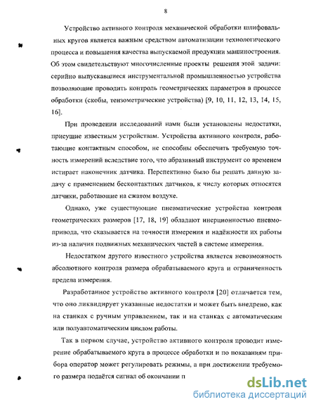 Анализируя работу [96], нужно отметить, что устройство активного контроля не давало сведений об абсолютном размере посадочного отверстия шлифовального круга, а установочная мера, по которой была проведена предварительная настройка, использовалась для сравнения с текущим размером.