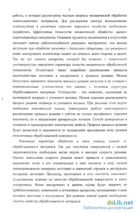 5 работы, в которых рассмотрены частные вопросы механической обработки композиционных материалов. Для расширения спектра использования углепластиков в различных отраслях народного хозяйства необходимо разработать эффективные технологии механической обработки данных композиционных материалов. Основное трудности заключаются в отсутствии методики оценки работоспособности режущего инструмента, что весьма актуально при обработке заготовки с большими габаритами, где размерный износ инструмента значительно влияет на точность всего изделия в целом. Так же нет четкого алгоритма, который бы позволил с приемлемой достоверностью определить параметры качества механически обработанной поверхности. Отсутствует также подробное рассмотрение процесса взаимодействия заготовки и инструмента в процессе резания. Нельзя безусловно применить принципы процесса резания металлов и их сплавов к композиционным углепластикам что связано с отличием структуры обрабатываемого материала. Углепластик - это композит, состоящий из полимерной матрицы и угольного волокна. Нельзя отдельно рассматривать процесс резания полимера и угольного волокна. При решении этой задачи необходим комплексный подход. Анизотропия требует многогранного рассмотрения процесса резания с учётом не только двухфазного строения композита, но и направления армирующих волокон. Способ армирования в основном и предопределяет анизотропия свойств. Природа процесса резания будет различной в зависимости от направления приложения силы резайия относительно обрабатываемой поверхности.