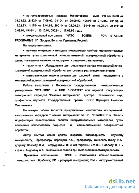 Работа выполнена в Московском государственном технологическом университете "СТАНКИН" и НПП "НОВАТЕХ" при научной консультации заведующего кафедрой "Резание материалов" доктора технических наук, профессора, лауреата Государственной премии СССР Верещака Анатолия Степановича.