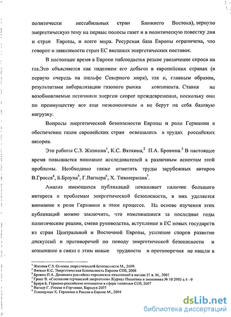 Вяткин К.С. Энергетическая безопасность Европы - СПб., 2004. 10 Бровин П.А. Российско-Германские отношения - М., 2007. " Жулин B.C. Вопросы энергетики ЕС - М., 2009.