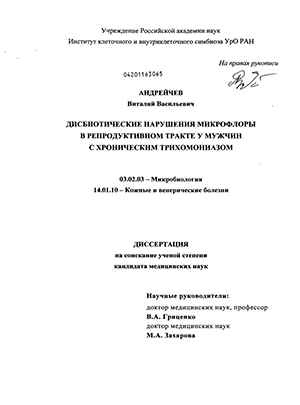 Анализ дисбиотических нарушений микрофлоры в репродуктивном тракте у мужчин, страдающих хроническим урогенитальным трихомониазом, с клинико-микробиологическим обоснованием подходов к оптимизации алгоритмов лабораторной диагностики и терапии данной патологии.