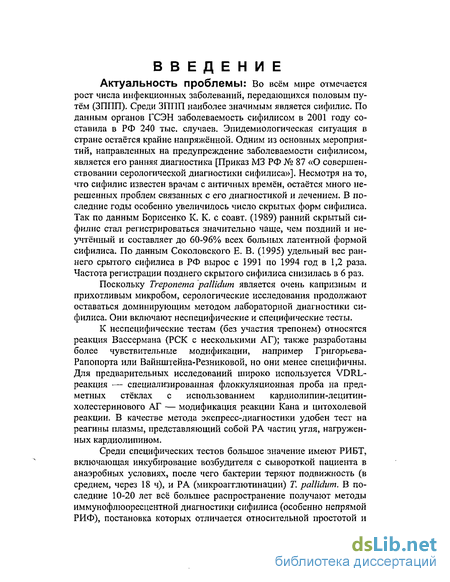 Таким образом, неясность происхождения ложноположитель-ных результатов серологических реакций на сифилис, трудности их дифференциации со скрытыми формами сифилиса вызывает необходимость поиска новых критериев дифференциальной диагностики специфической и неспецифической серопозитивности.