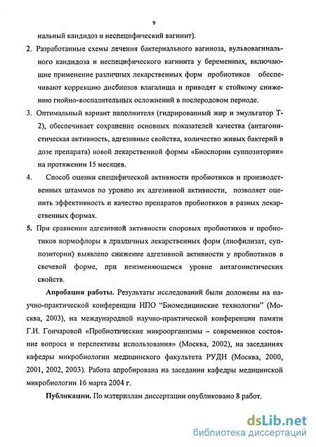 Разработанные схемы коррекции бактериального вагиноза, вульвовоги-нального кандидоза и неспецифического вагинита у беременных, включающие применение различных лекарственных форм пробиотиков биоспорина и бифидумбактерина, включены в методические рекомендации кафедры акушерства и гинекологии РМАПО.
