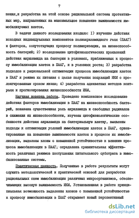 Научная новизна работы. Проведено комплексное исследование действия факторов иммобилизации в ПААГ на жизнеспособность бактерий, показана существенная роль акриламида и свободных радикалов в снижении их жизнеспособности, изучены патофизиологические особенности действия акриламида на бактериальную клетку, выявлены подходы к оптимизации условий иммобилизации клеток в ПААГ, ориентированные на повышение выживаемости клеток в процессе их иммобилизации, выделены клоны с повышенной устойчивостью к влиянию процесса иммобилизации в ПААГ; определена сравнительная эффективность различных режимов поступления питательного субстрата в иммобилизованные системы.
