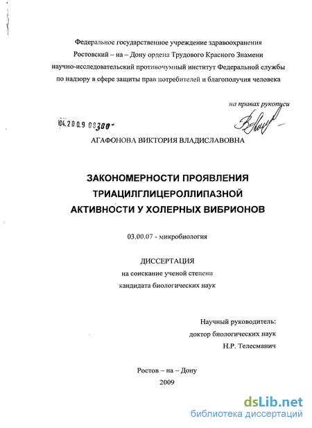 ственная научно-практическая конференция государств-участников СНГ «Чрезвычайные ситуации международного значения в общественном здравоохранении и санитарная охрана территорий государств-участников СНГ», (Оболенск, 2006г.); Научно-практическая конференция «Современные аспекты эпидемиологического надзора за особо опасными инфекционными заболеваниями на юге России», (Ставрополь, 2007г.); IX съезд Всероссийского общества эпидемиологов, микробиологов н паразитологов, (Москва, 2007г.); Международная конференция «Vibrio 2007», (Париж, 2007); VII Межвузовская международная конференция с международ, участ. «Обмен веществ при адаптации и повреждении», (Ростов-на-Дону, 2008г.); IX Межгосударственная научно-практическая конференция государств-участников СНГ «Современные технологии в реализации глобальной стратегии борьбы с инфекционными болезнями на территории государств-участников СНГ», (Волгоград, 2008г.). Получены акты внедрения в лабораторную практику разработанного антилипазного диагностического препарата от ФГУЗ «ЦГиЭ» Свердловской обл.; ФГУЗ Иркутский ПЧИ Сибири и Дальнего Востока Роспотребнадзора; ФГУЗ ПЧЦ Роспотребнадзора.План диссертационной работы одобрен Ученым советом Ростовского НИПЧИ и утвержден директором института 27.06.07 (протокол №3). Исследования выполнены в рамках плановых научных тем: № 0120.0 507857 «Триацилглицероллипазная активность холерных вибрионов 01»; № 01. 2. 007 07281 «Липазная и адгезивная активности холерных вибрионов не 01 серогруппы»